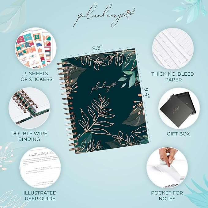 PLANBERRY Large Budget Planner & Monthly Bill Organizer with Pockets – Budgeting Book, Finance & Expense Tracker, 8.3x9.4″ (Green Pastures)
