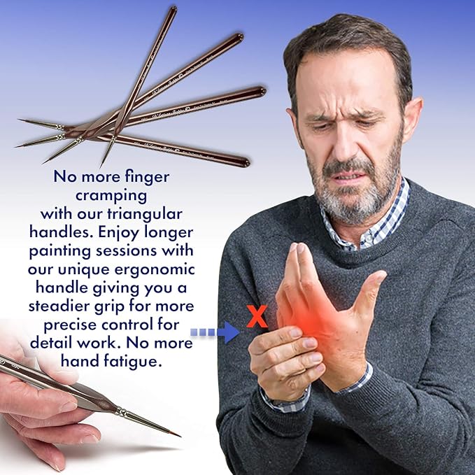 - Easy Grip Handle: Special triangular wood handle designed for a comfortable grip makes this fine tip paint brush easier to control for painting long hours thus reducing hand fatigue. The triangle grip also prevents your artist paint brushes from rolling off the table.