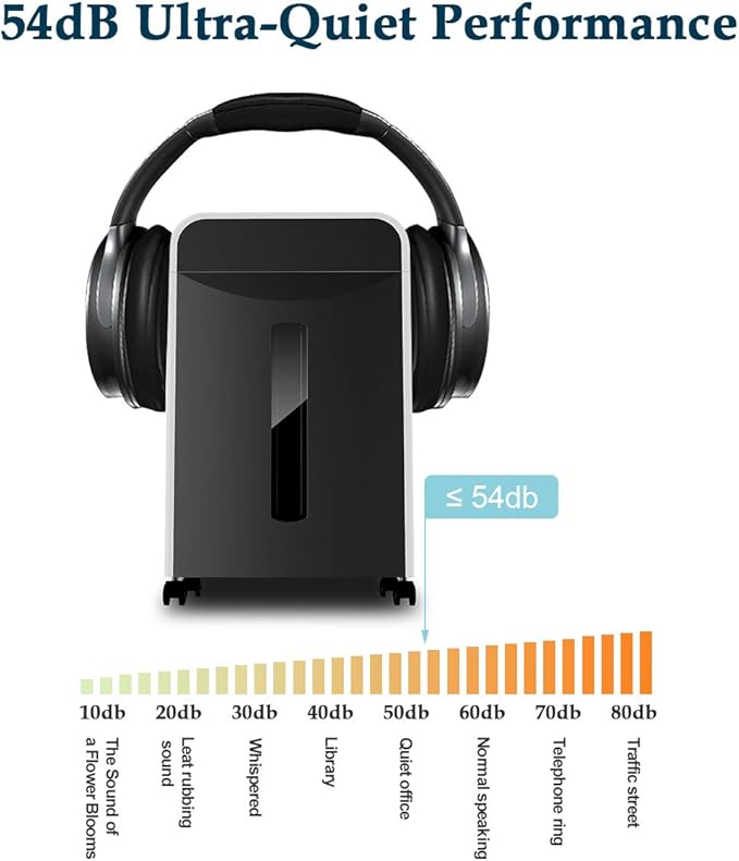 - LOW NOISE LEVEL of 54dB ultra-quiet performance paper shredder for home office has 5 gallons pull-out waste bin with easy viewing transparent window