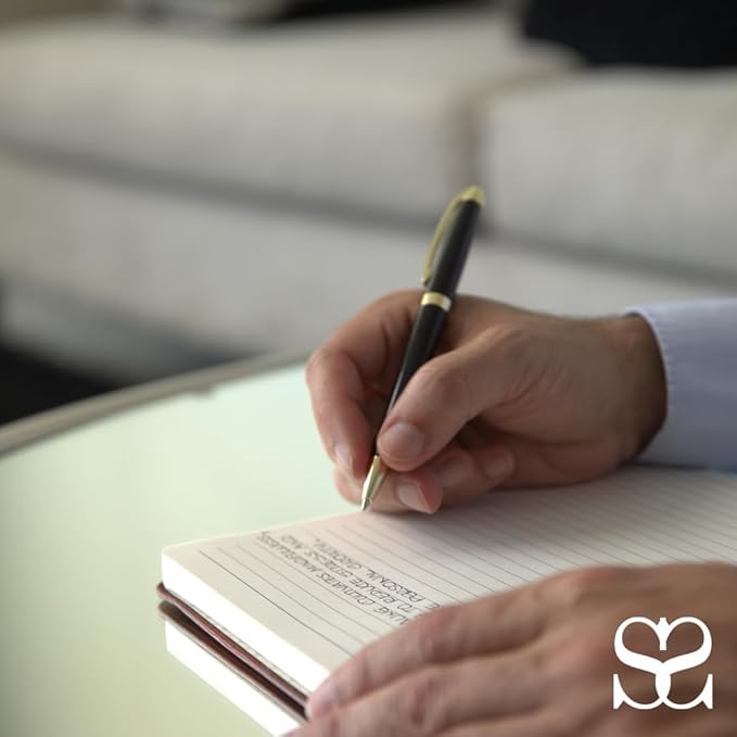- This journal leather set comes with a luxurious Settini Milano Pen, a black lacquered metal pen with gold trim, a brass barrel, a hinge clip, and a twist-action mechanism. It comes with a black German Ink refill (compatible with Parker Style) and a 1.0 mm tip size for precision writing. Perfect for documenting your journeys in this compass journal for writing.