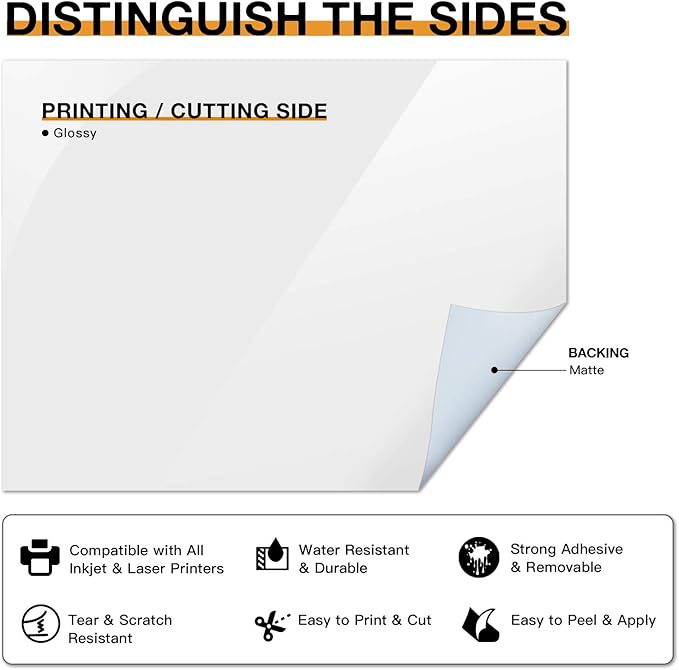 - COMPATIBLE WITH ALL PRINTERS & CUTTERS: These waterproof printable vinyl come in the standard size of 8.5x11” and are compatible with all laser and inkjet printers using normal ink(pigment ink for longer life). Our printable vinyl sticker paper is super convenient to print and very easy to cut, well suitable for all craft cutters. If any problems you meet, please tell us, our excellent customer service will solve them