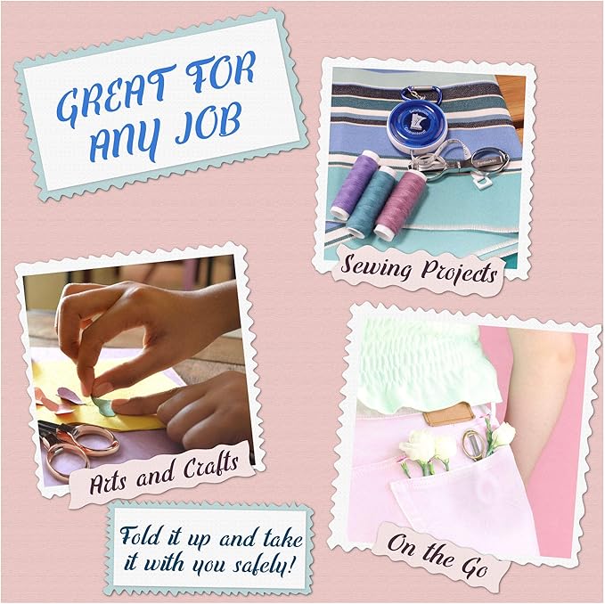 - SIZE When folding scissors are folded, they are 3.4" (8.6cm) in length. When scissors are open, they are 3.9" (9.9cm). Thread snips are 4.5". Fabric measuring tape is 2" when collapsed, ruler itself extends to 60" (152.4cm)