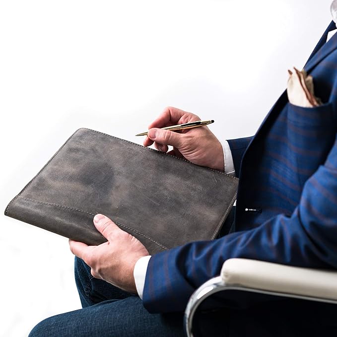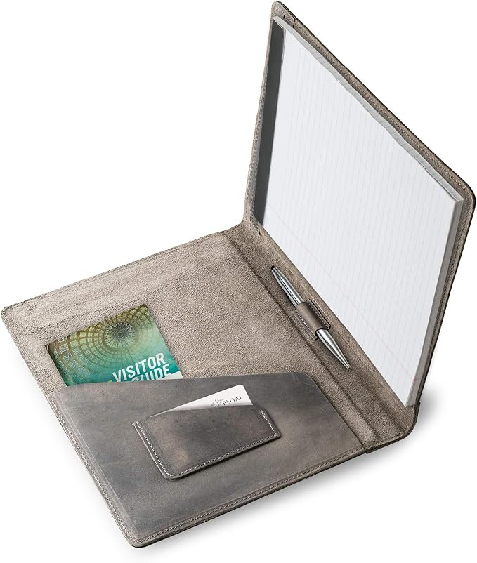 - FUNCTIONAL DESIGN: Elegant leather portfolio with safe pockets for documents, business cards, and travel tickets. Features a pen holder and refillable writing pad. (LEGAL PAD NOT INCLUDED)