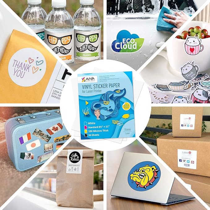 - High-Quality Printable Vinyl Paper - set includes 50 white vinyl sheets of Printable Sticker Paper for laser printer, Glossy finish. US Standard Letter Size - 8.5"x11". Suitable for High resolution and clear image quality