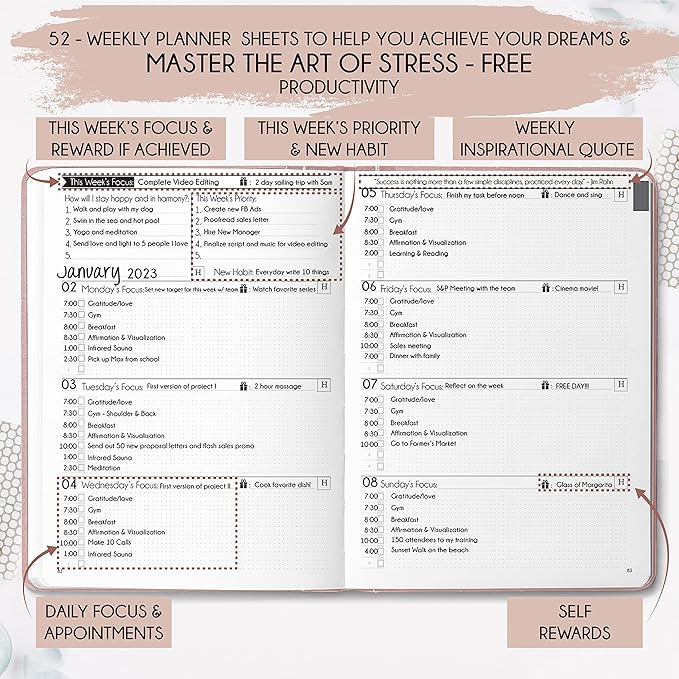 - INCREASE YOUR PRODUCTIVITY AND HAPPINESS BY 300% - Help you become much more productive by teaching you how to focus only on your top priorities and delegate the rest. So you can achieve more and create more free time, happiness for yourself. The perfect productivity and time management planner. This Weekly Planner includes To-Do Lists, Feel-Good Lists & Gratitude Journal - The weekly/monthly feel-good list will help you not to forget yourself and put yourself first.