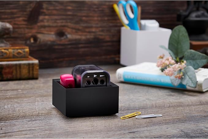 - Organizes stick notes, paperclips, cords, and other small desktop essentials