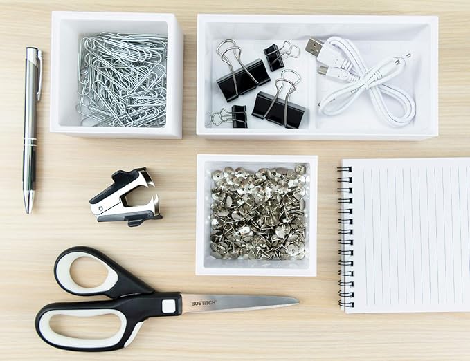 - Organizes stick notes, pens, paperclips, cords and other desktop essentials