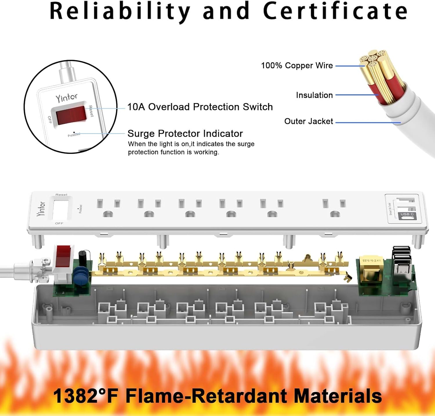6 Ft Power Strip Surge Protector - Yintar Extension Cord with 6 AC Outlets and 3 USB Ports for Home, Office, Dorm Essentials, 1680 Joules, ETL Listed, White