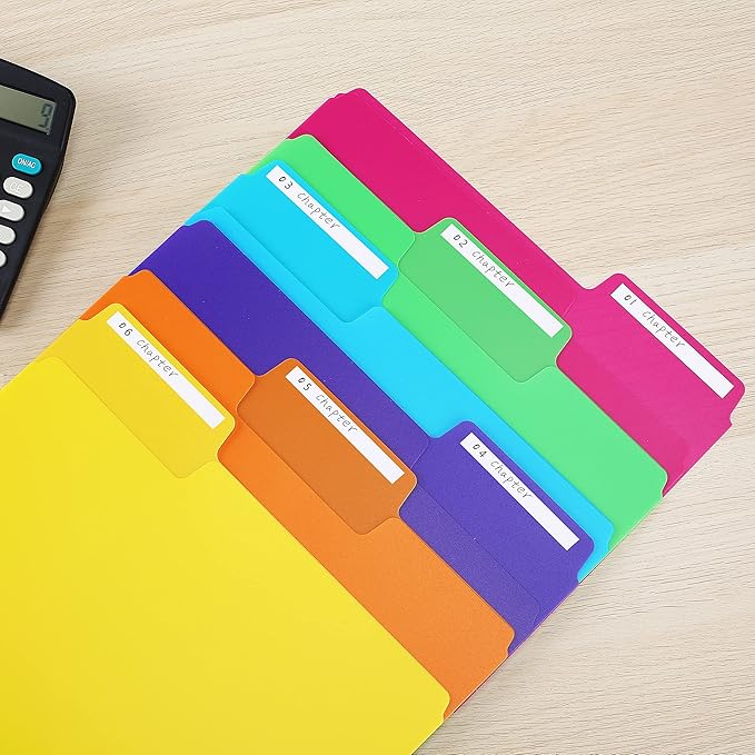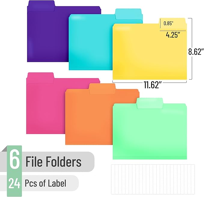 - The package includes 6 file folders in different bright color and 24 pieces of label