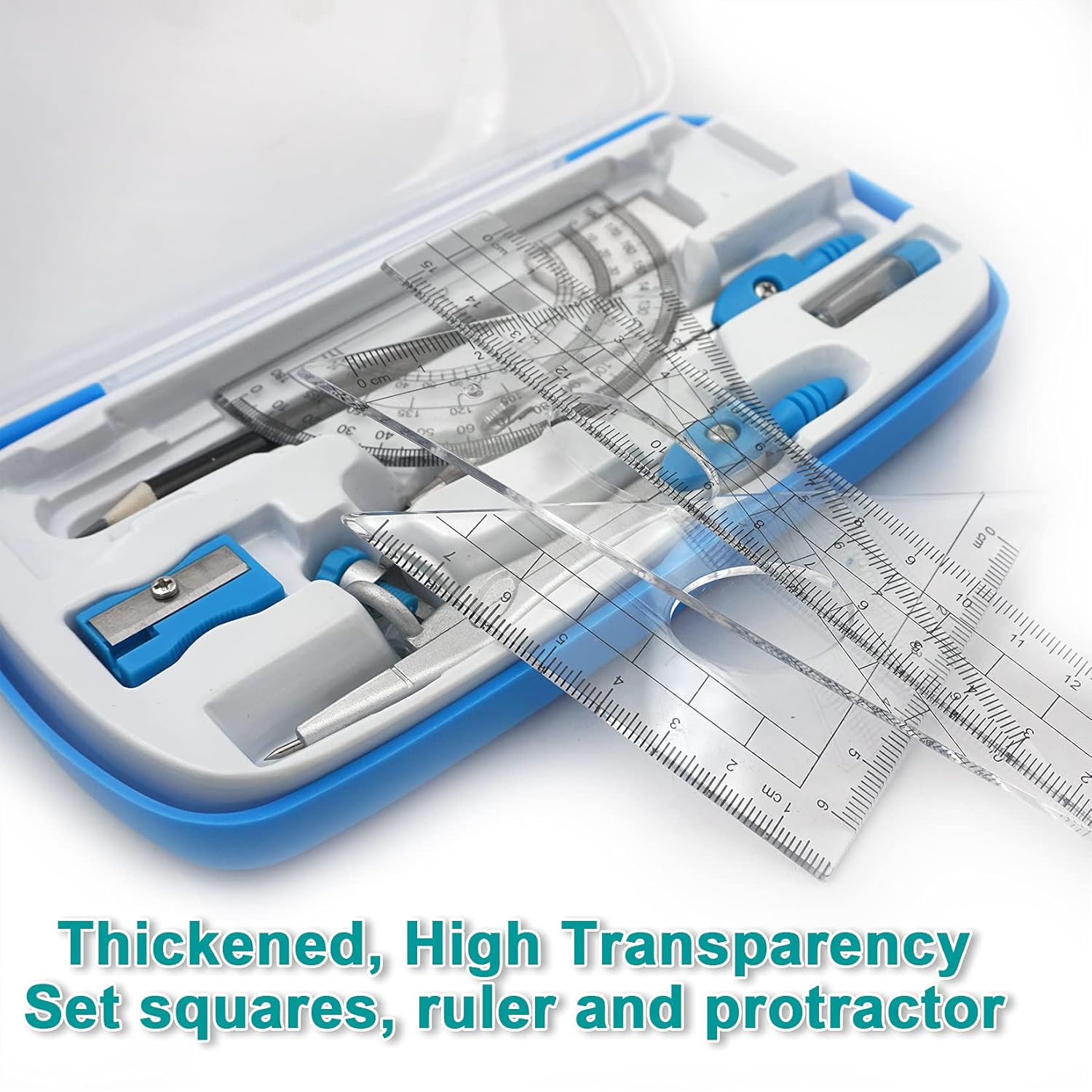 Math Compasses Back-to-School Starter Geometry Kit with 2 Drafting Compasses Protractor Set Squares Ruler and More for Students Maths Study Homework, Blue Set with Carry Case