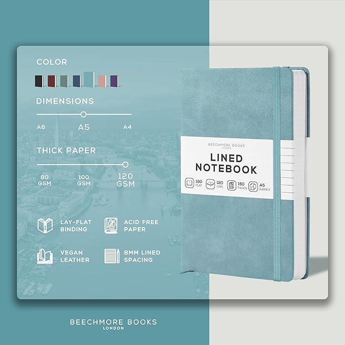 BEECHMORE BOOKS Lined Journal Notebook, 5.8 x 8.3 inch, A5 160 Lined Pages, Hardcover Leather Journals for Women, Men, Writing and Notebooks for Work - 120 GSM Thick Paper, Gifts Box Included