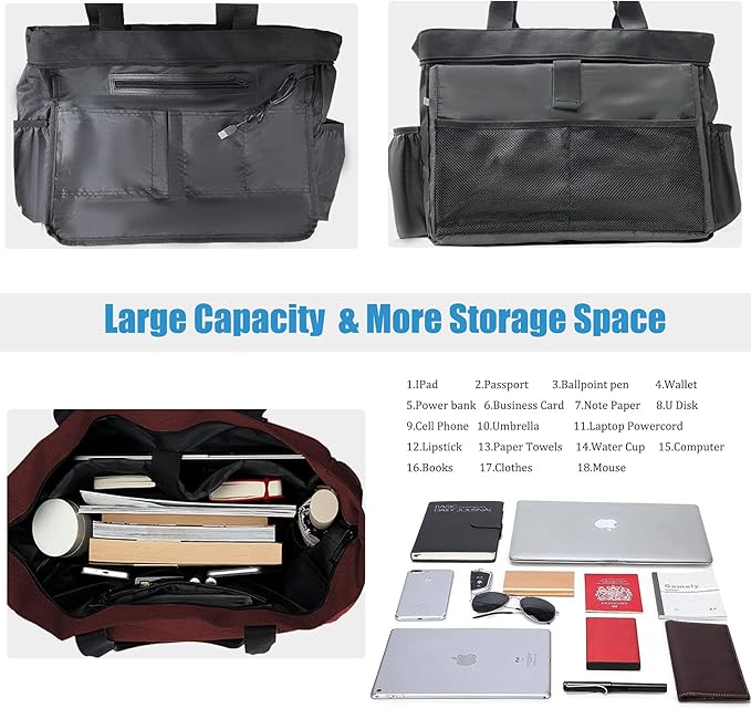 - WELL ORGANIZED WOMEN'S TOTE BAG:Large shoulder tote laptop bag Multiple compartments that could keep your things well organized.1padded main compartment for 17 inch laptop bag,1open pockets perfect for documents and personal things,2 Storage mesh belt, 1 inside pocket with zipper and 5 special pockets and compartments for wallet, pens and smartphone.2 inner Side pocket and 2 outer Side pockets for umbrella, water cup.There is a front 3 large zipped pocket for quick access that easily fits items