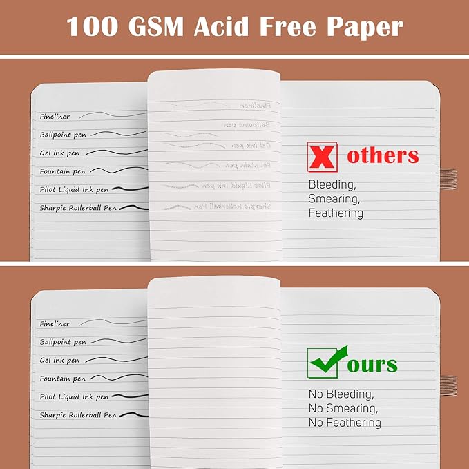 - Fountain Pen Paper: No Bleeding through for most ink pen is our paper's rigorous standard. After hundreds of test, we apply upgraded 100 GSM off-white Acid Free Paper, which helps write smoothly without ghosting, smearing and avoid eyes tiredness.
