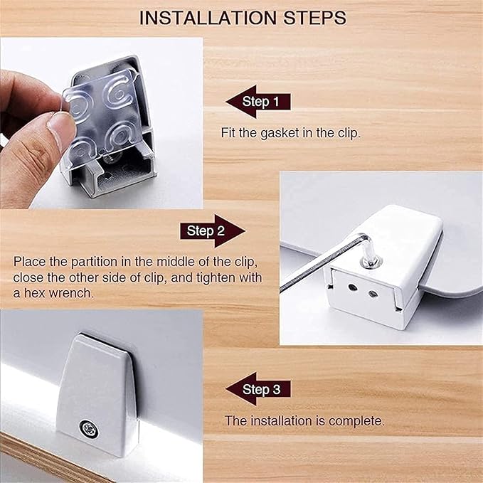 - EASY INSTALLATION: Clamp these desk dividers to your desk for a secure, yet flexible setup. 1.Peel the greenish film; 2.Install the washer in the clamp; 3.Put it on the table and tighten it with a screwdriver, or use the nail-free glue to fix the clip on the table; 4.Place the partition in the middle of the clamp, close the other side and tighten it with a wrench