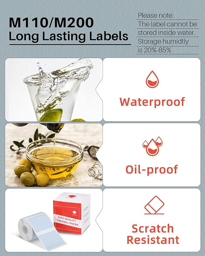 - √ Clear Printing- Phomemo self-adhesive Multi-Purpose labels are water resistant, oil resistant, abrasion resistant and strong adhesion. BPA free