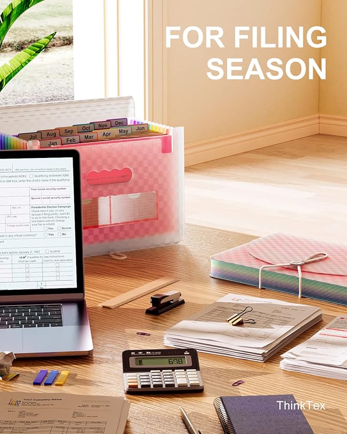 ThinkTex Accordian File Organizer, 12 Pockets Expanding File Folders, Portable Monthly Bill Receipt Organizer, Colorful Tabs, Letter/A4 Size - Pink
