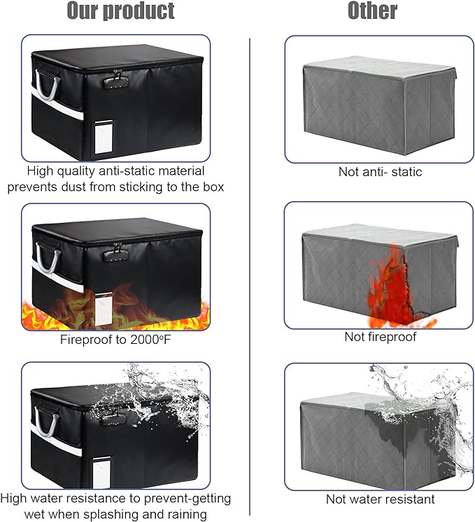 - Fireproof and water-resistant safe: The exterior material of Fireproof File Box is made of upgraded anti-static silicone coated fiberglass, which can withstand temperature up to 2000℉. Fireproof Document Box is not only fireproof but also highly water-resistant, so you don't have to worry about your important documents getting wet by rain.(Does not include folders)