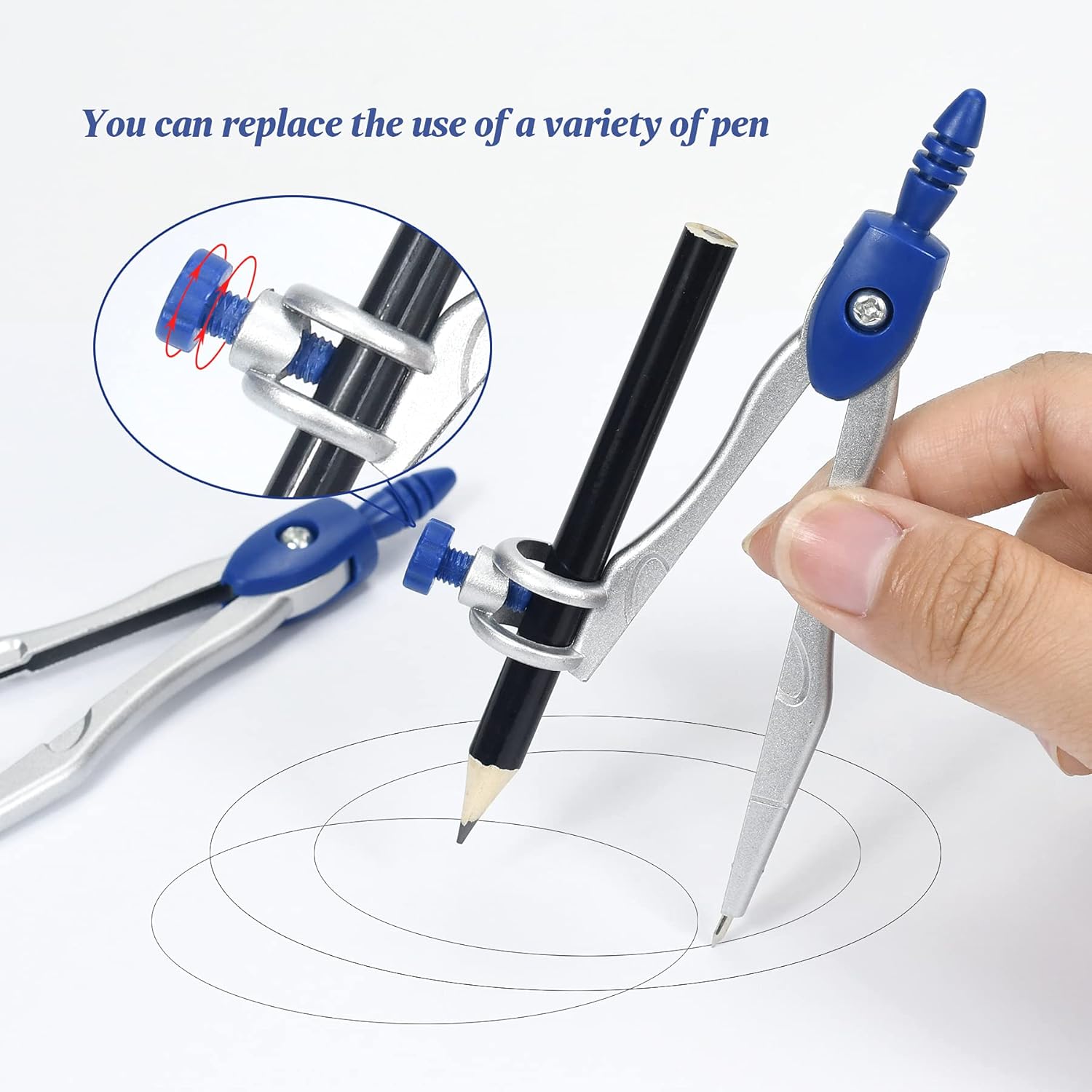- A Practical Compass Geometry Set: Metal compasses will not bend, Ergonomically designed compass head is comfortable to hold, Universal Holder Compass work with any standard sized pencil or pen