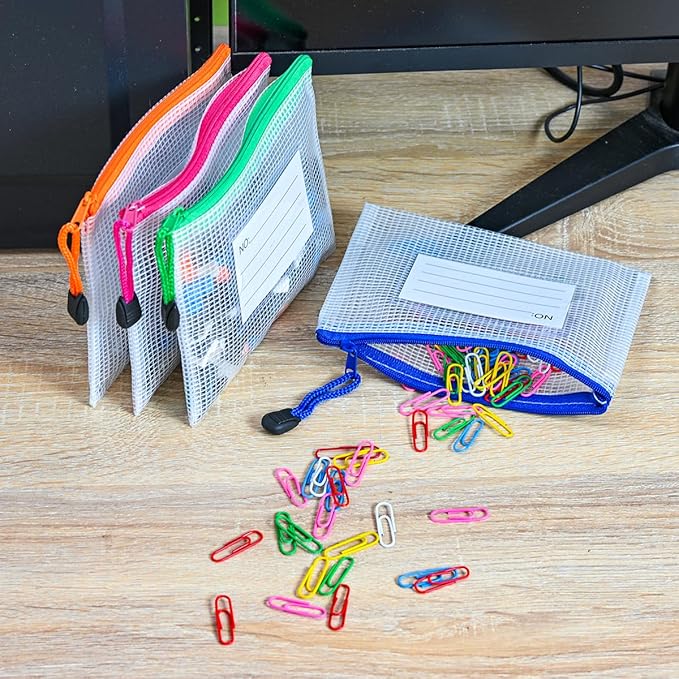 - 12Pcs Mesh zipper bags with label pocket, A6 size 6.3x4.7 inch. Widely used in Office Home Hospital and Travel. Great zipper file bags, board game storage bags, pencils pouches, puzzles bags, cross stitch projects bags or keeping various craft projects organized. These mesh bags could meet your needs in all ways