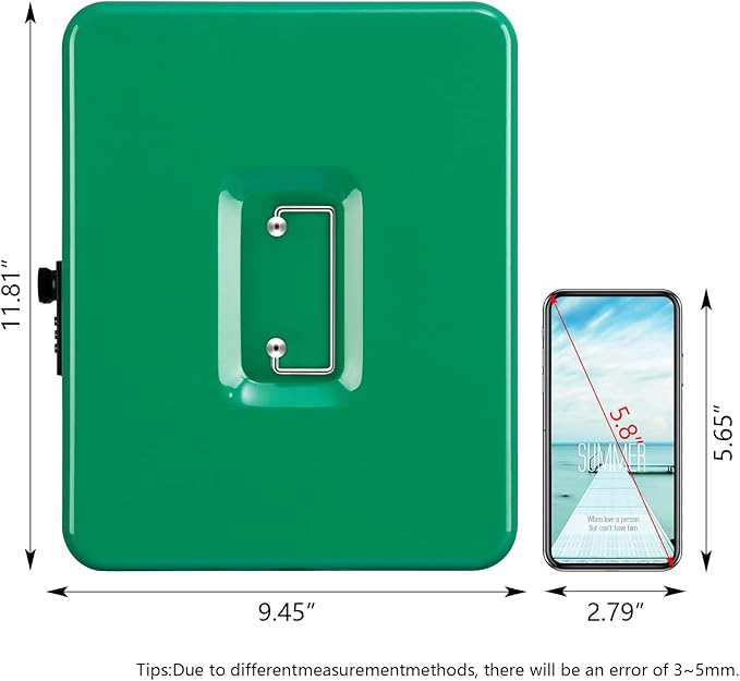 - SIZE AND COLOR: The size of the money safe box is 11.81"x 9.45"x 3.54" (300*240*90mm), and the color is Green ,bright and fashionable.