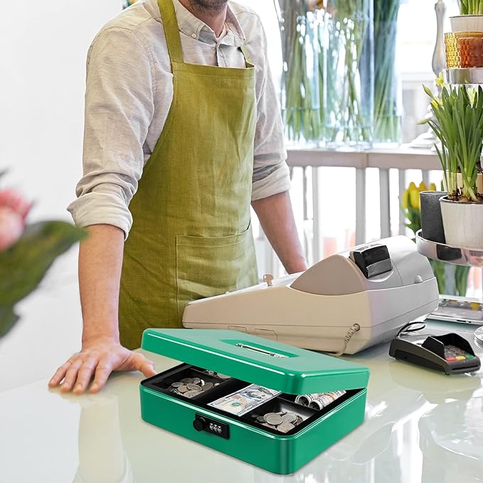 KYODOLED Metal Cash Box with Combination Lock Money Box for Cash Safe Metal Box with Money Tray for Security Lock Box 11.81"x 9.45"x 3.54" Green X Large