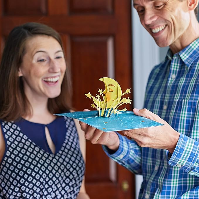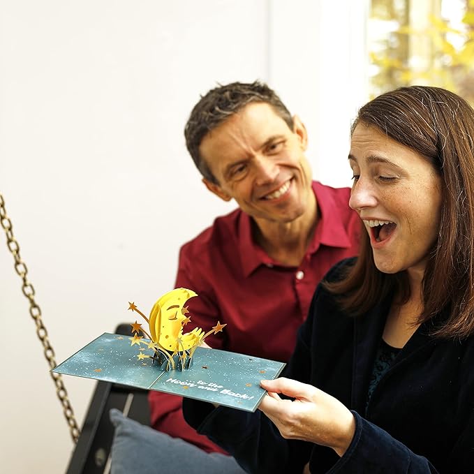 - CREATE A MAGICAL MOMENT FOR YOUR LOVED ONE: Give a thoughtful card to your husband, wife, or that special person you love! This 5" x 7" Lovepop Love You to the Moon and Back Pop Up Card, features a cute crescent moon 3D design. Perfect anniversary, birthday, or just because card.