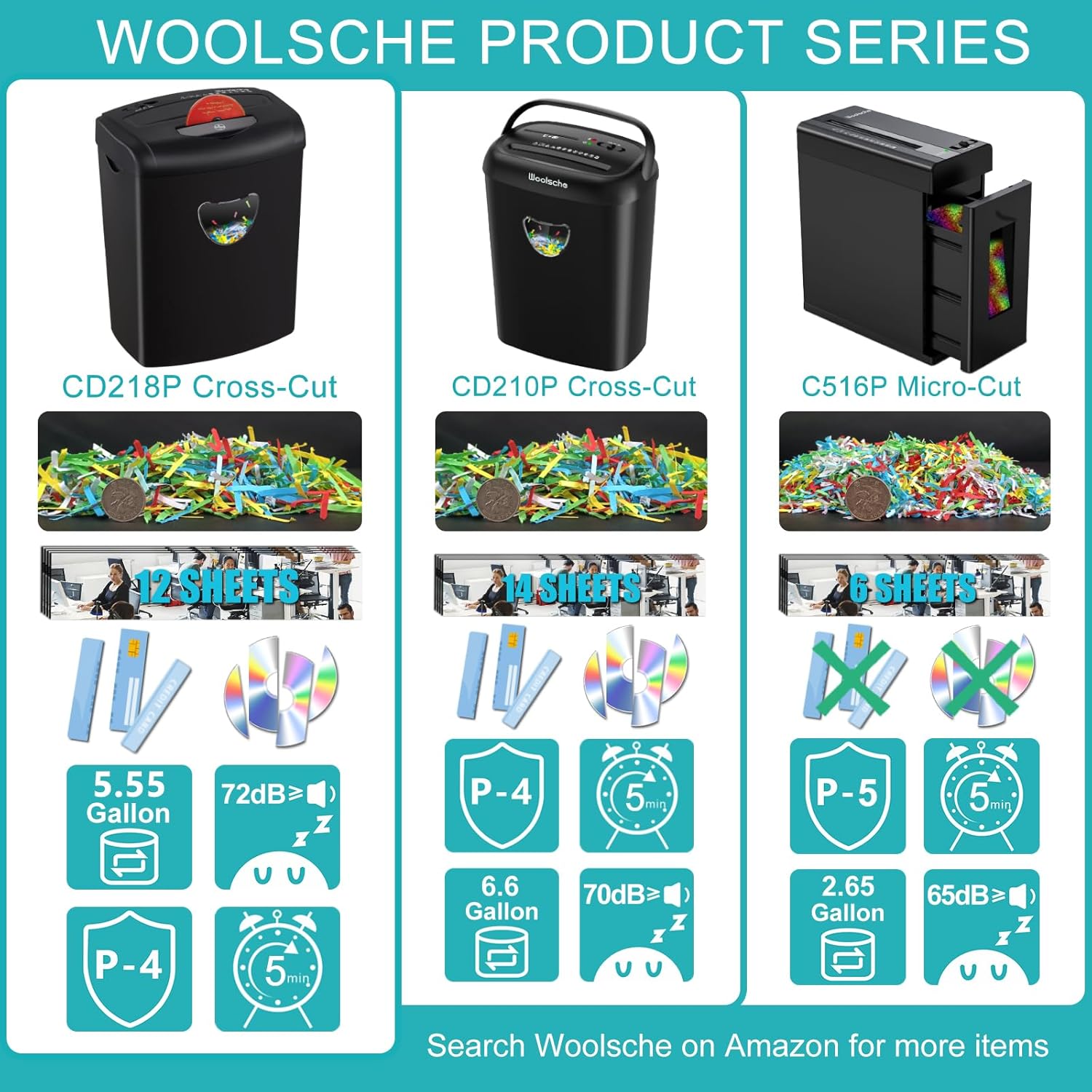 Woolsche 12-Sheet Cross Cut Paper Shredder with Large 5.55-Gallon Basket - P-4 Security, 3-Mode Shred for Cards/CDs/Staples/Clips - Jam Proof System for Office (ETL Certified)
