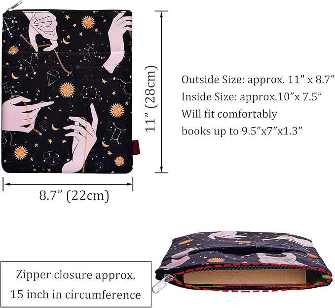 - Extra Sleeve Pocket - The book sleeve is made of cotton canvas /polyester ,it can be washed when it gets dirty. The book cover is also enhanced with a pocket which is perfect to hold a notebook, small journal, pen/pencil, phone, kindle, or even some smaller books!