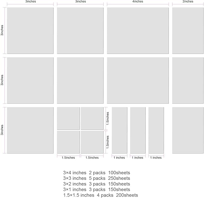 - ►【Size】: (1.5"x1.5" 4 pcs, 3"x1" 3 pcs, 3"x2" 3 pcs, 3"x3" 5 pcs, 3"x4" 2 pcs) 17 pcs 850 sheets