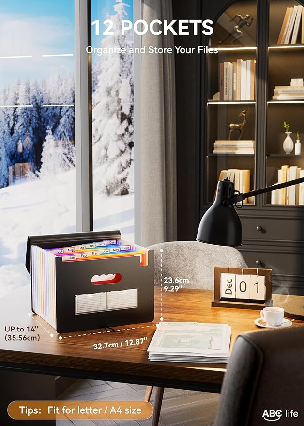 - 【12 Expanding File Folder】ABC life pockets accordian file organizer suitable for filing tax and storing important family documents. Product size is 13 "x 9.4"x 14", top and bottom are both expandable, For letter/A4 size files.