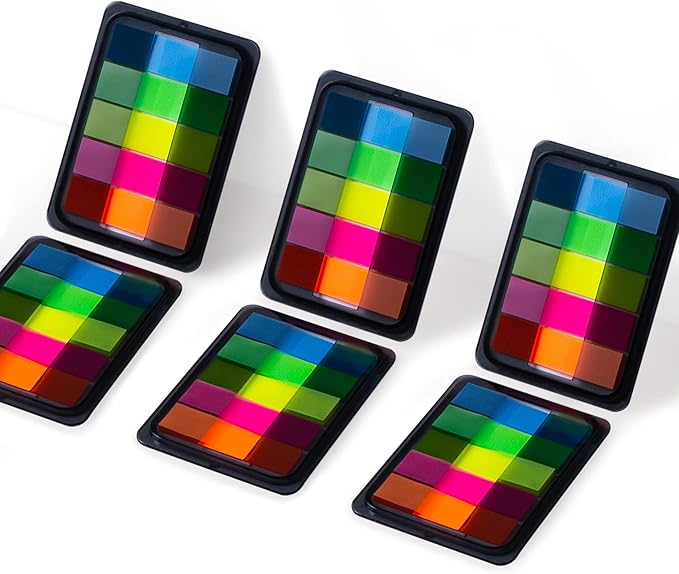 - [PACKAGE INCLUDES] Sticky tabs:6 sets of 600 pieces, size:1.73 inch X 0.47 inches. 5 fluorescent transparent colors, 20 pieces of each color.