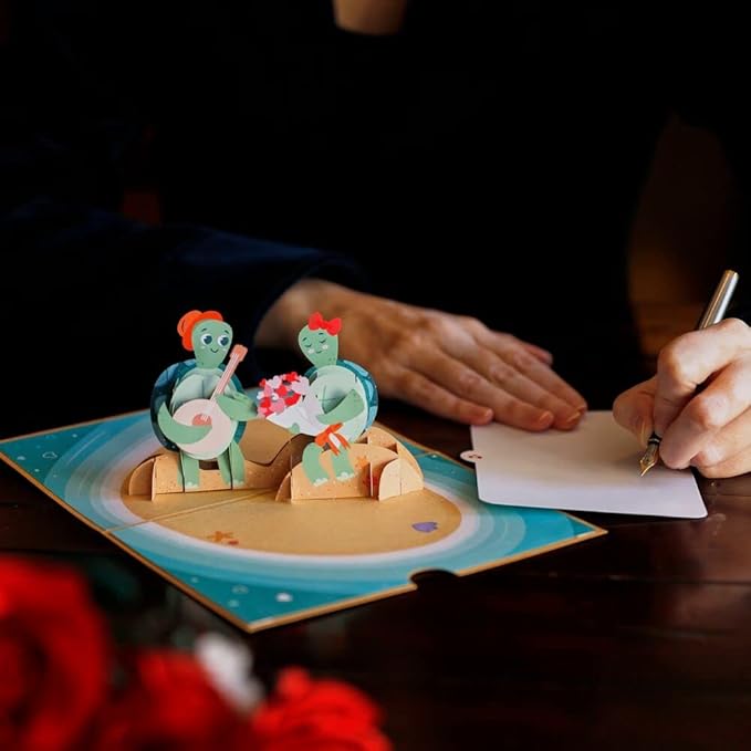 - CREATE A MAGICAL MOMENT FOR YOUR LOVED ONE: Give a thoughtful card to your husband, wife, or that special person you love with the 5" x 7" Lovepop Turtley in Love Pop Up Card. Features a turtle serenading their turtle loved one on a beach that opens in your hand. Perfect anniversary, birthday, or just because card.