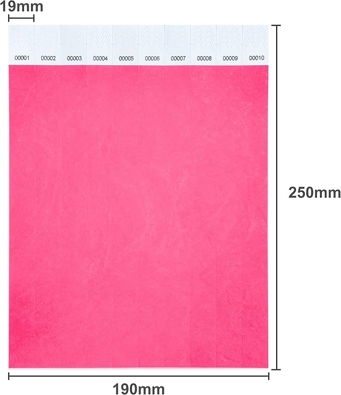 - NeonPink wristbands are10" long and 3/4" wide. A piece of paper is 10 wrist straps. 100 wristbands have 1-100 consecutive numbers.