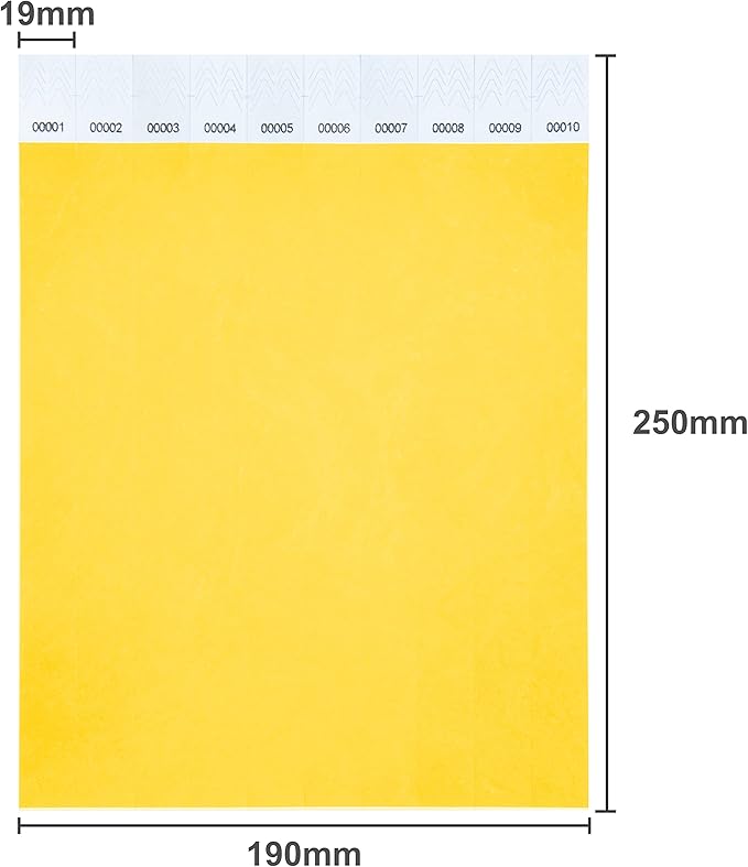 - NeonYellow wristbands are10" long and 3/4" wide. A piece of paper is 10 wrist straps. 100 wristbands have 1-100 consecutive numbers.