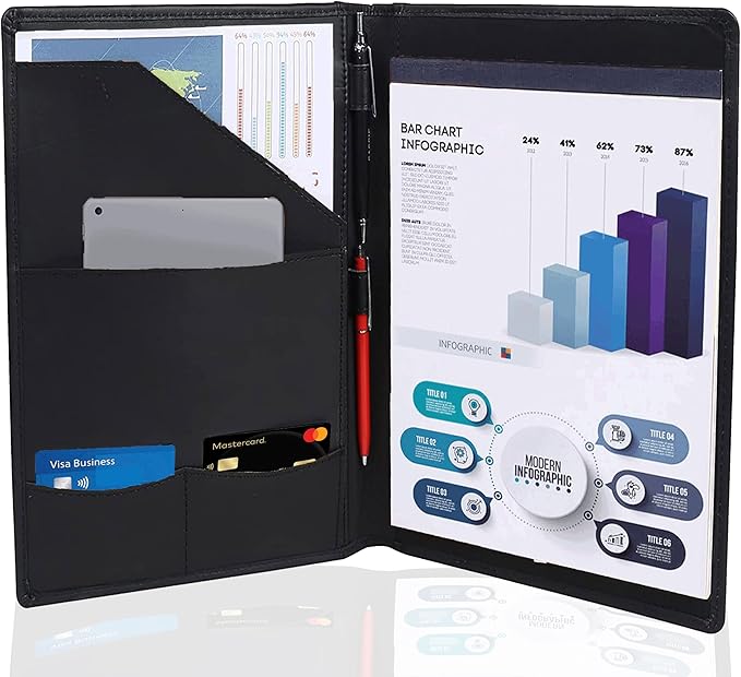 - { PROFESSIONAL BUSINESS PADFOLIO } – Black leather portfolio is a perfect choice for you. It can be your partner in office, school or other working places and helps you to manage a4 size document like resume or etc.
