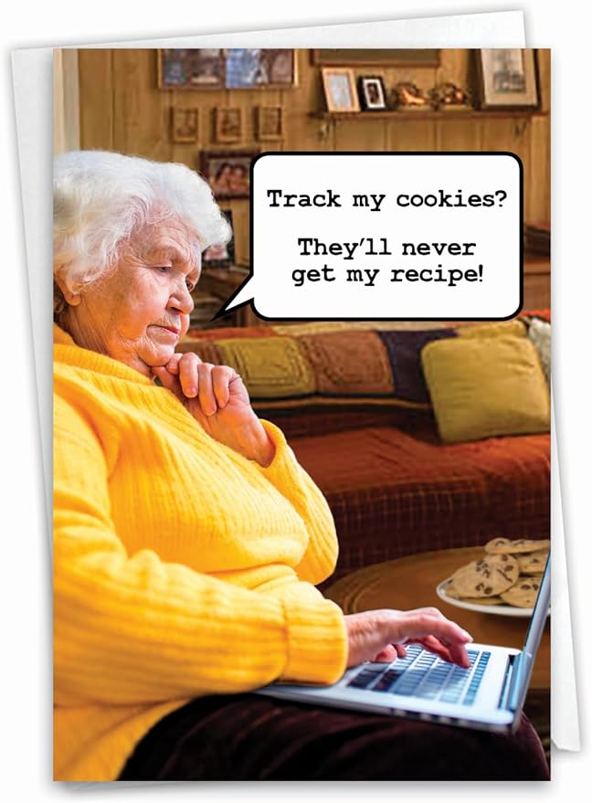- INSIDE GREETING: "Or find out your real age! Happy Birthday!" COVER - Track my cookies? They'll never get my recipe!