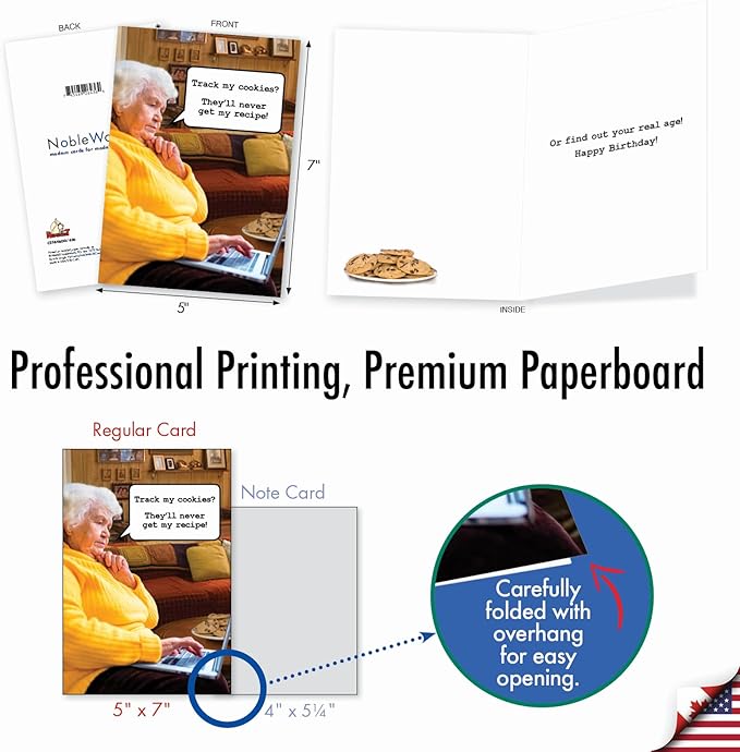 NobleWorks - Funny Happy Birthday Note Card with Envelope (4.63 x 6.75 Inch) - Bday Greeting Card for Women and Men - Congrats Bday Celebration Notecard - Track Cookies C2384BDG