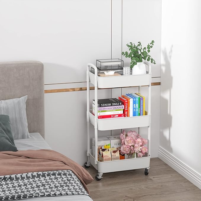 Sywhitta 3-Tier Plastic Rolling Utility Cart with Handle, Multi-Functional Storage Trolley for Office, Living Room, Kitchen, Movable Storage Organizer with Wheels, White