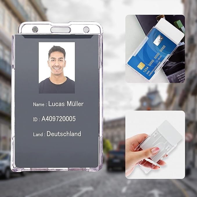 - Solid Clip & Card Holder. The carabiner badge reel clip is solid and can be easily clipped on your pants, belts, pockets. and each reel comes with a vertical PC clear badge holder, which is really perfect for your IDs, key rings and work badges.