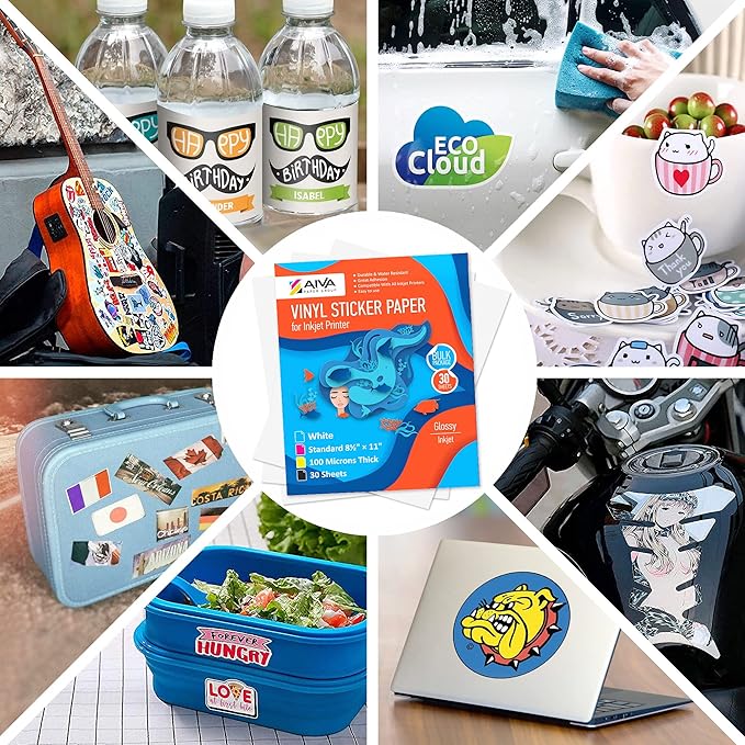 Printable Vinyl Sticker Paper - Waterproof Decal Paper for Inkjet Printer - 30 Self-Adhesive Sheets - Glossy White - Standard Letter Size 8.5"x11"