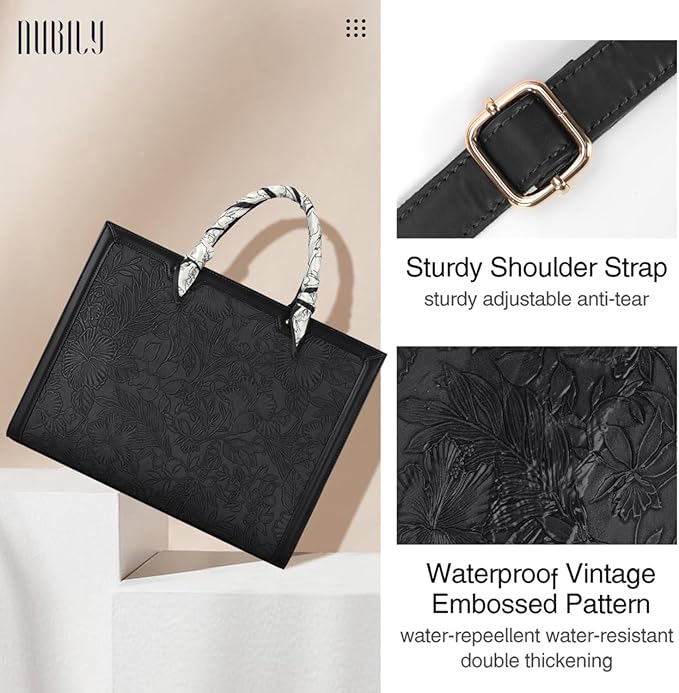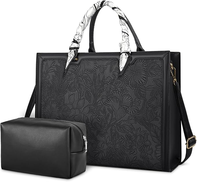 - 【HIGH-QUALITY DURABLE LAPTOP BAG】This women laptop bag is made of durable, waterproof, scratch-resistant PU leather and polyester lining. The smooth metal zipper on the top makes it easy to open. The sturdy handle and metal accessories make the tote bag more durable. And it has a detachable elegant silk scarf ornament attached in the front of this black professional briefcase. The metal feet can protect your laptop bag from damage.