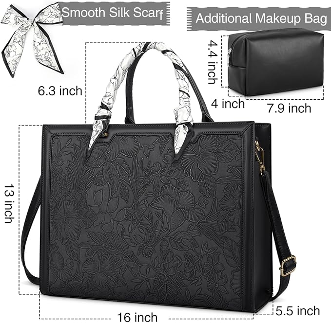 - 【HANDBAG SIZE】The size of the briefcase for women is 16 x 5 x 13 inches (L*W*H); the length of the detachable shoulder strap: 25.2-47.2 inches; the size of the makeup bag is 7.9 x 4 x 4.4 inches (L*W*H). This laptop bag for women has a comfortable leather handle, adjustable and detachable shoulder strap, and a secure top zipper closure. With such a large organized laptop tote bag, it can satisfy all your daily necessities.