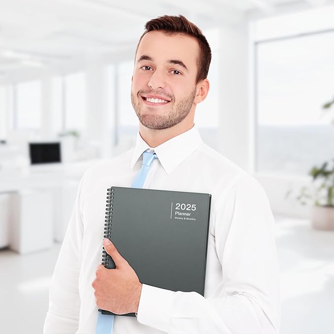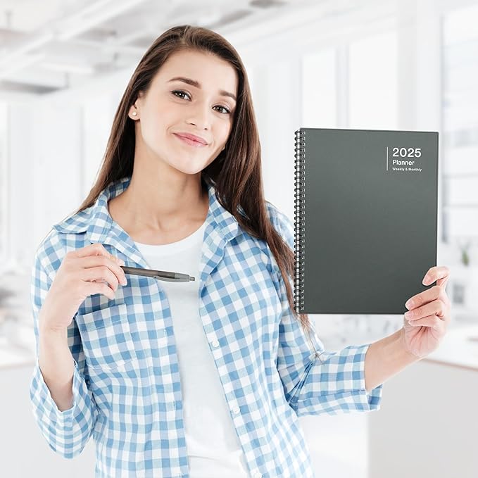 - 2025 Planner Book: Use 12 Months, Jan 2025 to Dec 2025, Planner: 8.5x11 Planner Book, Generous size for home or office. Includes: Laminated gray tabs, Bookmark, 8" Back pocket (not letter size), Stickers.