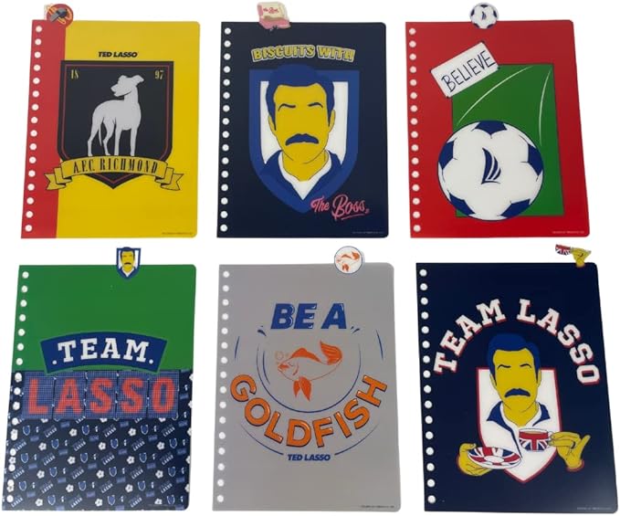 - TEAM LASSO NOTEBOOK - Features lined pages with colored Ted Lasso icons on the corners, 6 color illustrated section dividers, and tab dividers.