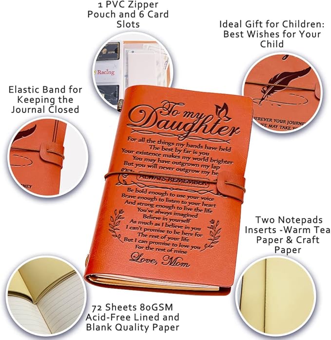 Daughter Gift from Mom, To My Daughter Leather Journal, 140 Page Refillable Writing Journal, Christmas Birthday Gifts for Daughter from Mom, Mother Daughter Gifts for Adults Daughter