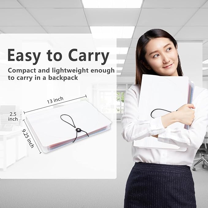 - Portable & stylish: Classic lightweight folder organizer can be compressed to a minimum thickness of about 2 inches, so it can be held up great for traveling to and from all different locations for work. Fits perfectly when completely closed in the file cabinet. The dividing sections of the rainbow file folders come in six bright colors, stylish and beautiful. Versatile document organizer for home, office, school, and travel scenarios, compact and light.