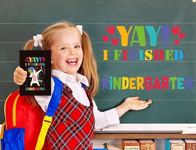 - Kindergarten Graduation Card: Kindergarten graduation card features funny unicorn holds a pen design with Yay I finished Kindergarten,great graduations gift card for kids boy girl student kindergarten graduates.