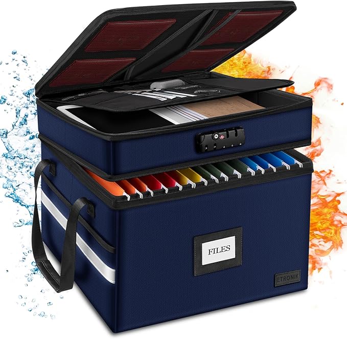 ETRONIK Fireproof Document Box with Lock, 2-Layer File Box Storage Organizer with 5 Tabs& Insert, Portable File Cabinet Storage Box with Handle for Hanging Letter/Legal Size Folder/Certificate, Blue