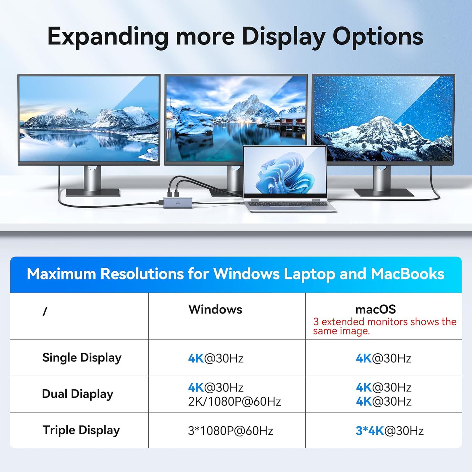 - 4K@60Hz High-definition Image: The usb c docking station dual monitor can easily to achieve dual monitor and triple displays for Windows(Note:MacBook laptops not support dual /triple displays). Single use HDMI 1/DP,resolution up to 4K@60Hz, single use HDMI2,resolution up to 4K@30Hz. USB C adpter connecting with 2 hdmi ports or hdmi1/2+display ports,dual monitors will be 4K@30Hz and 1080P@60Hz(DP1.4). usb c docking station connecting with dual hdmi+Display ports,triple monitors will be 1080P