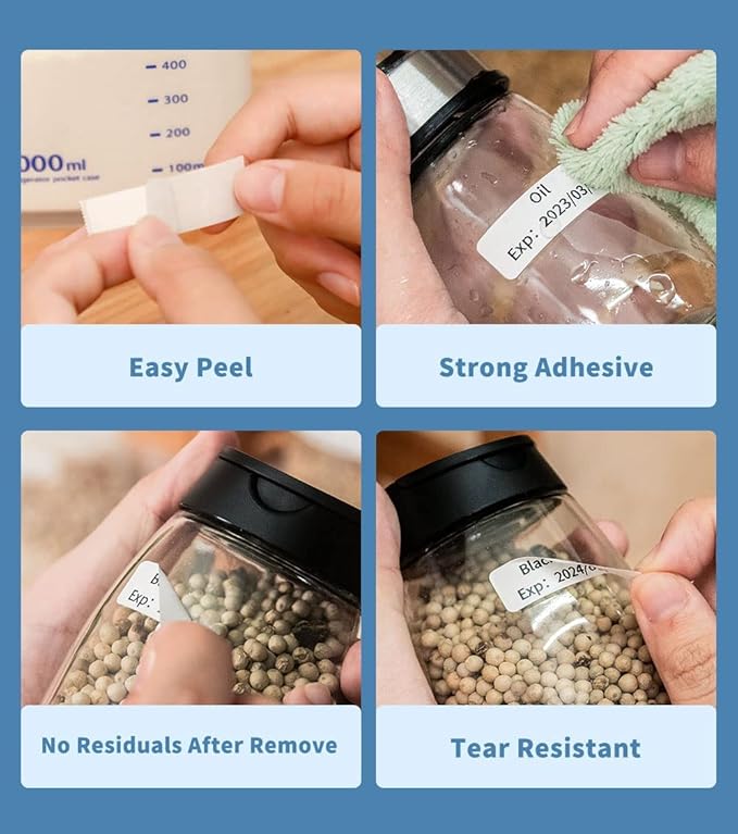 - Durable - Phomemo self-adhesive multifunctional labels are waterproof, oil-resistant, wear-resistant and highly viscous. Can be firmly attached to envelopes, paper, plastic, glass, and metal, without residue after peel off.